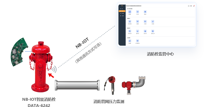 智能消防栓监测器对消防栓用水、撞倒、水压、漏损进行监控,将消防栓状态、用水情况等数据通过CDMA/GPRS/NB-IoT网络实时发送给监控中心,监控中心再通知自来水公司巡查人员进行现场取证、制止、恢复。